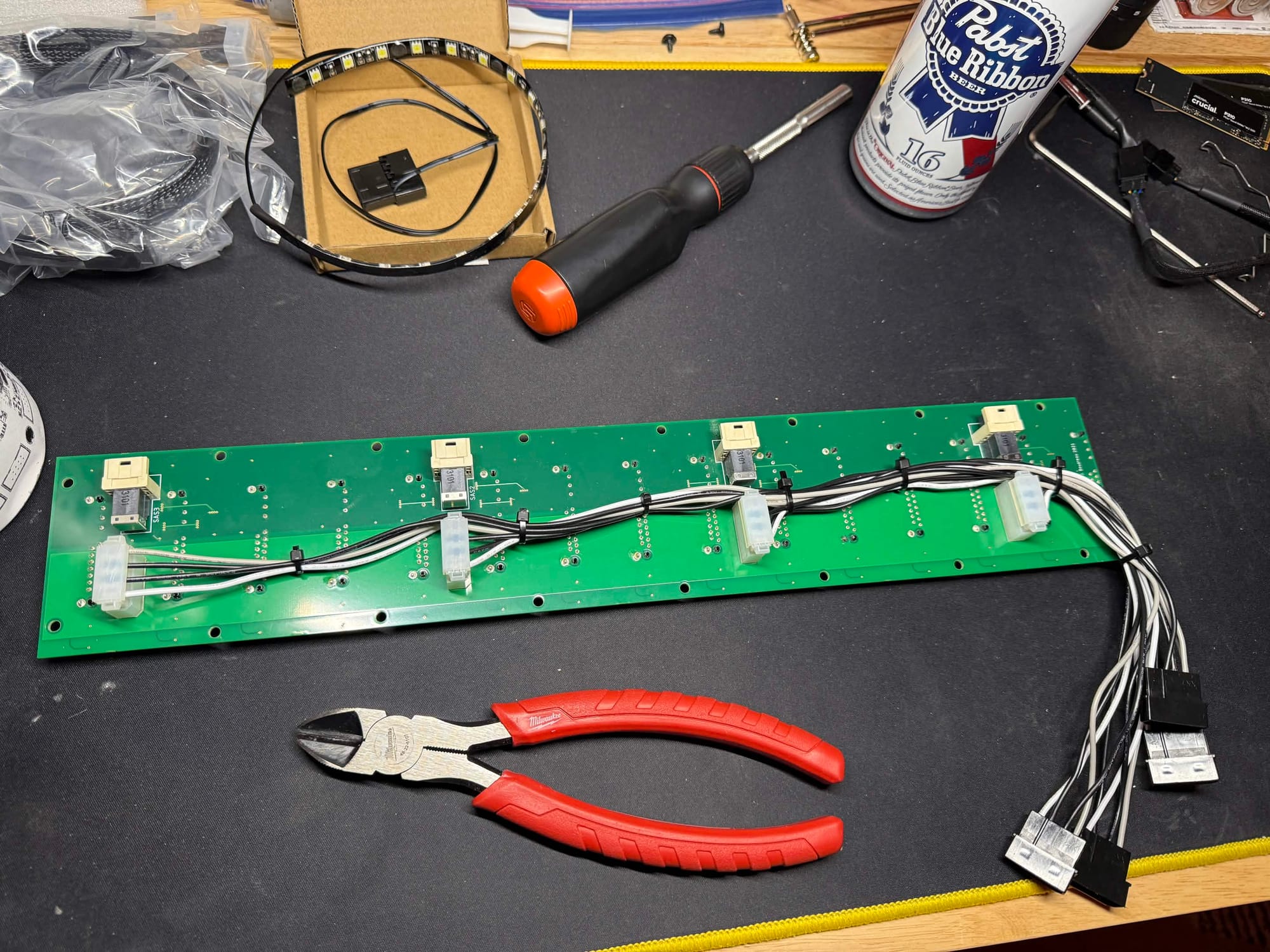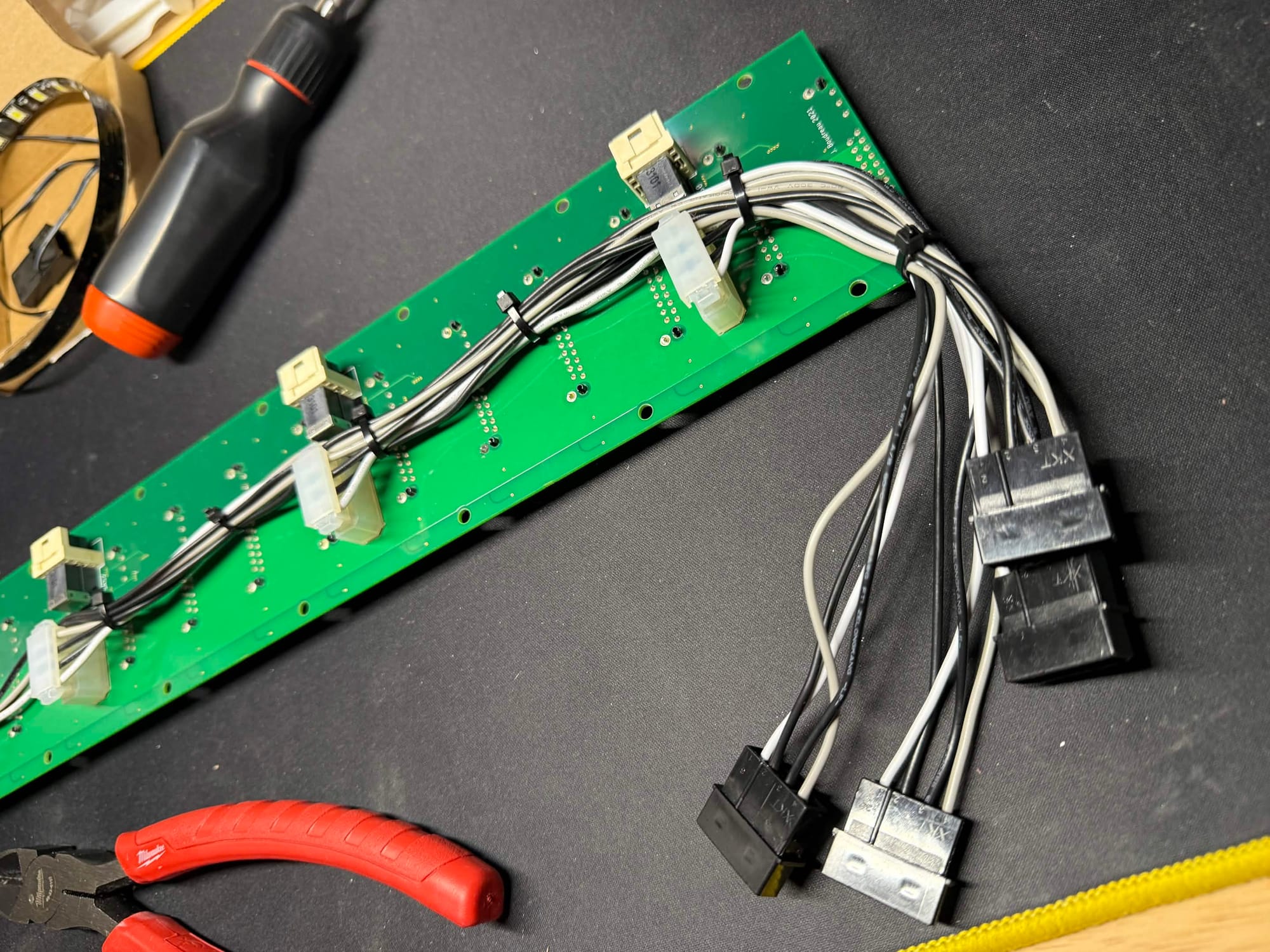Pictured: The backplane, re-using the 90° 4-Pin Molex connectors with custom male Molex adapters wired in.