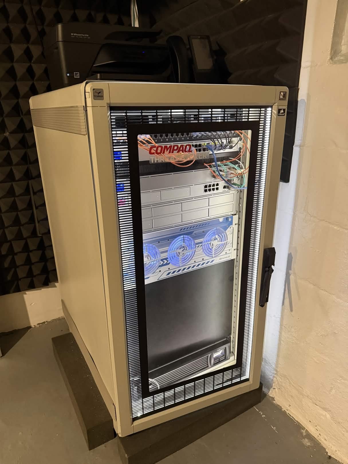 All my server hardware lives inside of an old Compaq Rack 7000. It's been great so far! I was able to find the keys for the latches as well. It's entirely enclosed with a plexiglass front door with vents to pull in fresh air. The rear panel is all metal mesh to allow the hot air to vent. I talk about the rack some more here.